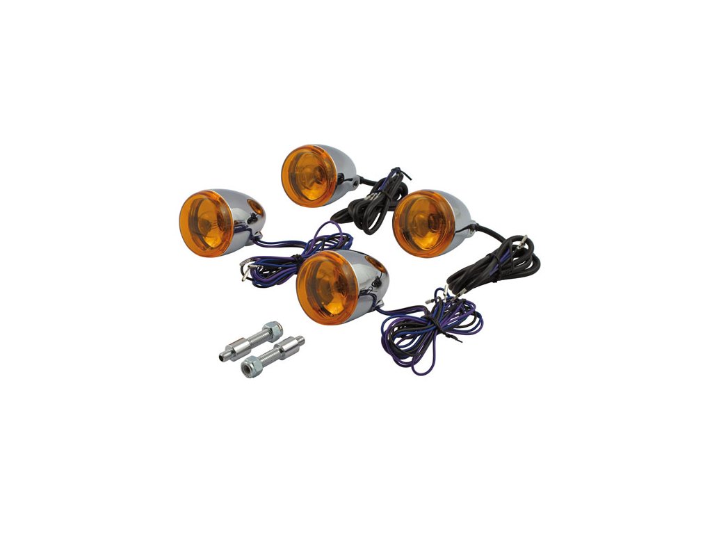 Sada kulatých blinkrů ve stylu pozdního Bullet s jantarovými skly a dvouvláknovými žárovkami.