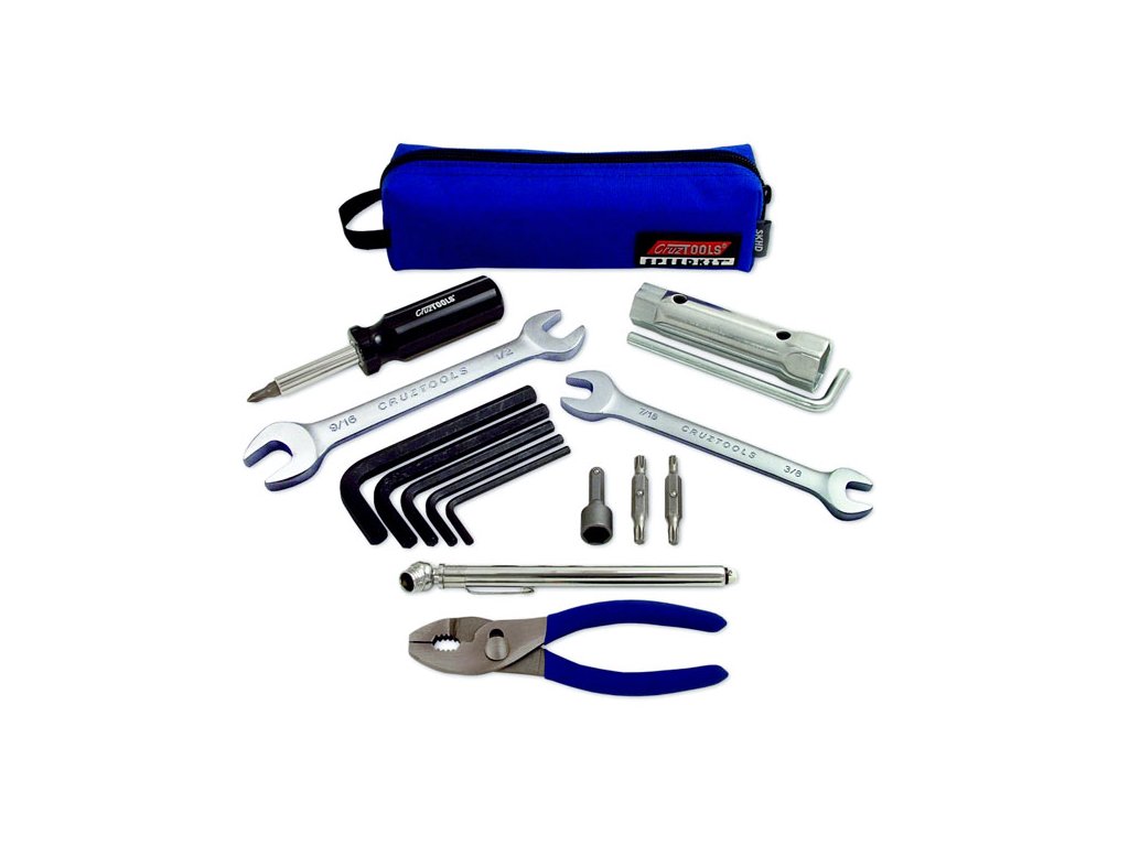 Silniční sada nářadí s malými vnějšími rozměry, která se snadno přenáší na motocyklu. Baleno v polyesterovém vyztuženém pouzdře na zip o rozměrech pouhých 5cm x 5cm x 18cm. Zahrnuje 9/16 x 5/8 a 1/2 x 9/16 klíče; měřidlo tlaku v pneumatikách; 140mm kleště; sadu šroubováků 5-1; 5/8 x 3/8 klíč na zapalovací svíčky s pákou. 10mm ovladač matice; T20; T25; T27 a T30 torx bity a 1/8; 5/32; 3/16; 1/4 a 5/16 imbusové klíče.