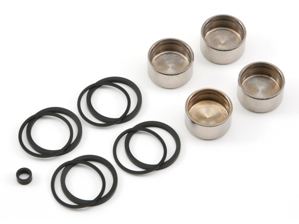 Kompletní sady se čtyřmi kusy od každého pístu, protiprachových těsnění pístu a těsnění pístu. Sada na opravu přední brzdy obsahuje také těsnění poloviny třmenu. Na rozdíl od OEM máme k dispozici také sady pouze s těsněním pro jeden přední nebo zadní třmen.