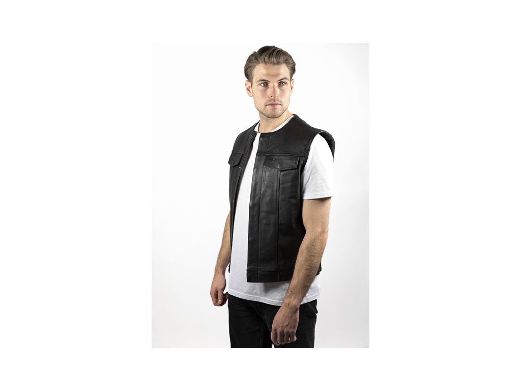 Tato kožená vesta se zapínáním na zip a knoflíky je vyrobena z 1-1.1mm hovězí kůže s bavlněnou vnitřní podšívkou pro prodyšnost a pohodlí. Na přední straně dvě uzavíratelné kapsy a vnitřní náprsní kapsy.