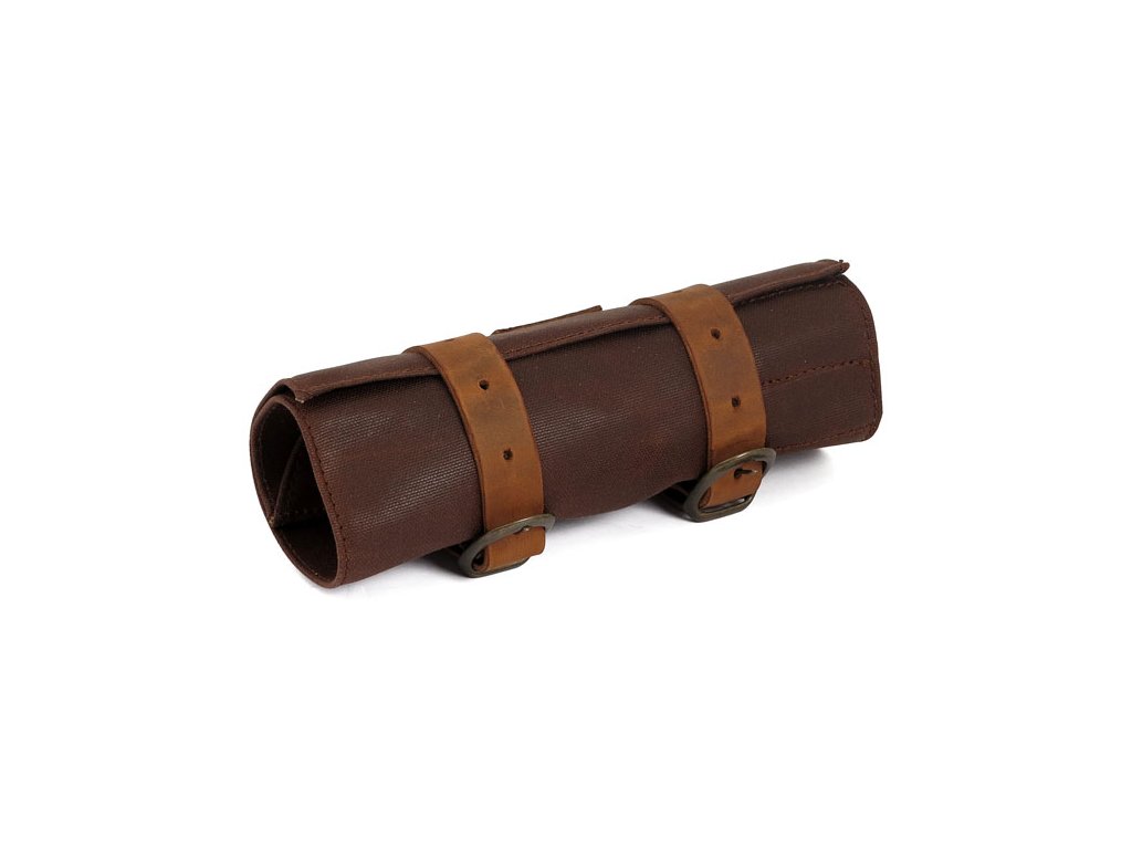 Hnědá kaštanová. Vyrobeno z voskované bavlny a kožených popruhů ranger. Rozbalí se a nabízí předšité přihrádky na nářadí a další nezbytnosti. Instaluje se pomocí přiložených kožených popruhů. Přibližné rozměry rozbalené: 35cm x 25cm.
