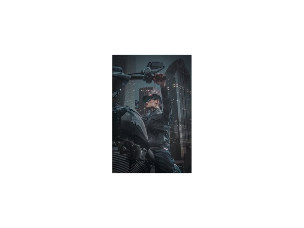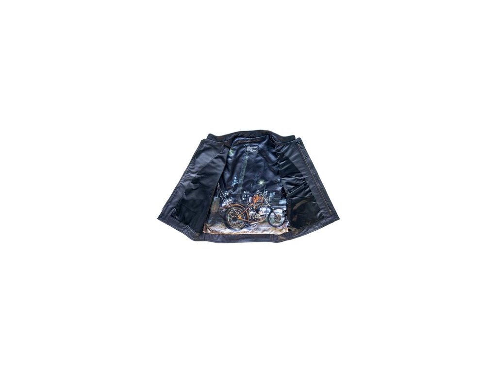 Hrdě představujeme novou koženou vestu 13 ½; Night-Rider! Klasicky stylizovaná vesta z bubnově barvené buvolí kůže. Na podšívce bundy jsme nechali natisknout skutečného přeživšího ze sedmdesátých let. Podle starých registračních dokumentů byl tento chopper Triumph T120 Bonneville z roku 1968 postaven v roce 1970 chlapíkem jménem James M. Fenske někde v New Jersey; USA. Od té doby měl mnoho majitelů; ale nikdo na něm nic nezměnil. Nakonec byl prodán nadšenci chopperů v Amsterdamu; kde jsme měli příležitost ho vyfotit za chladné lednové noci. A nyní se motocykl posunul dál. K novému majiteli; který snad obdivuje jeho tradiční vzhled stejně jako my. Střih této vesty je založen na nošení přes tričko; svetr; nebo jen tak. Pokud ji chcete nosit přes bundu; možná budete potřebovat větší velikost než obvykle. Na přední straně je zip a patentky; a zipy na předních kapsách. Už nehledejte; toto je vaše nová oblíbená kožená vesta!