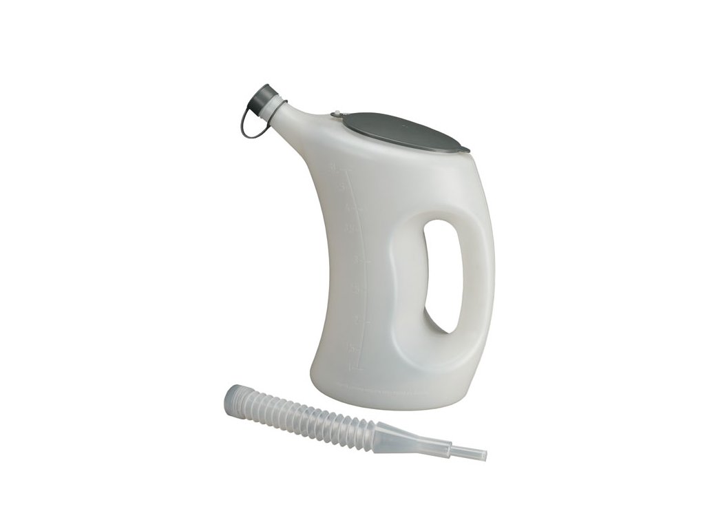 5 litrů s dělením stupnice po 0.50 litru. Rozměry 300mm x 135mm x 380mm výška. Bílý/průhledný HDPE (polyethylen s vysokou hustotou) kontejner s šedým HDPE ochranným víčkem výlevky. Větší šedé víko je vyrobeno z polypropylenu. Přiložená 160mm bílá/průhledná pružná výlevka je vyrobena z LDPE (polyethylen s nízkou hustotou). Používá se k měření tekutin s integrovaným anglickým; americkým a německým dělením stupnice. Odolná vůči oleji; kyselinám a palivu; odolná proti rozbití a stabilní. Teplotní rozsah -10°C až +120°C.